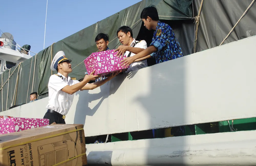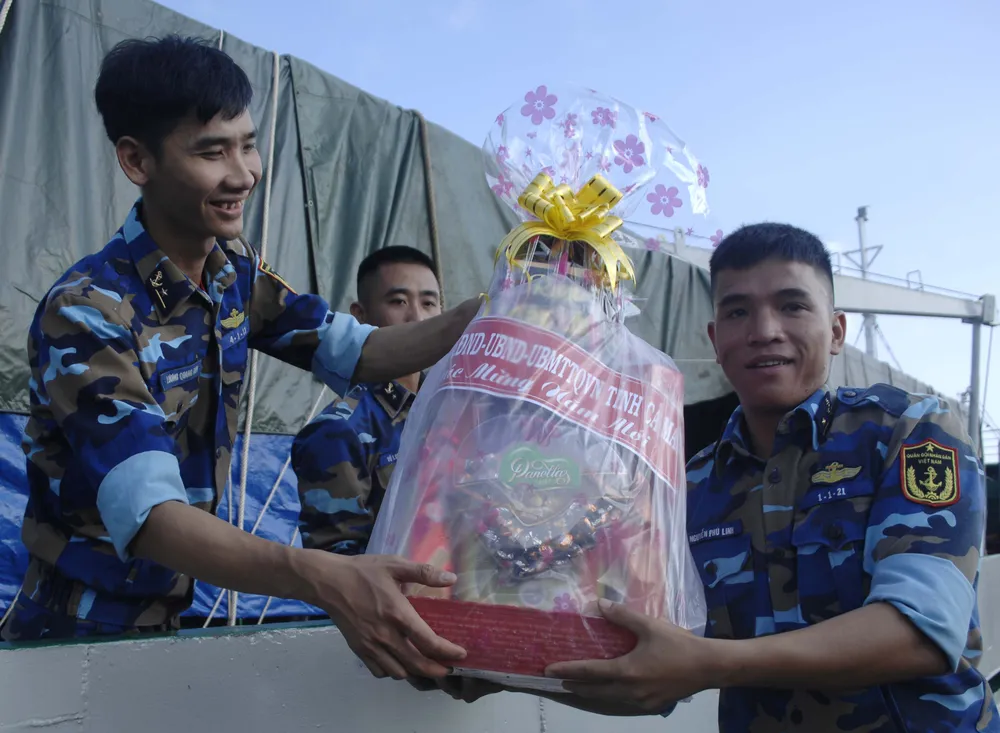 Chuyến tàu 632 vượt hàng ngàn hải lý mang đến cho các chiến sĩ đảo Hòn Chuối, Hòn Khoai, Thổ Chu, Hồn Đốc, Nam Du... những phần quà xuân ấm áp. Ảnh: TÍN HUY