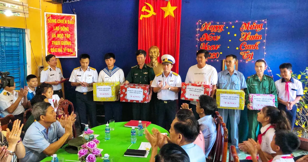 Bộ Tư lệnh Vùng 5 và đại biểu các tỉnh, thành phố phía Nam trao quà cho cán bộ, chiến sĩ, học sinh đảo Hòn Chuối. Ảnh: TÍN HUY