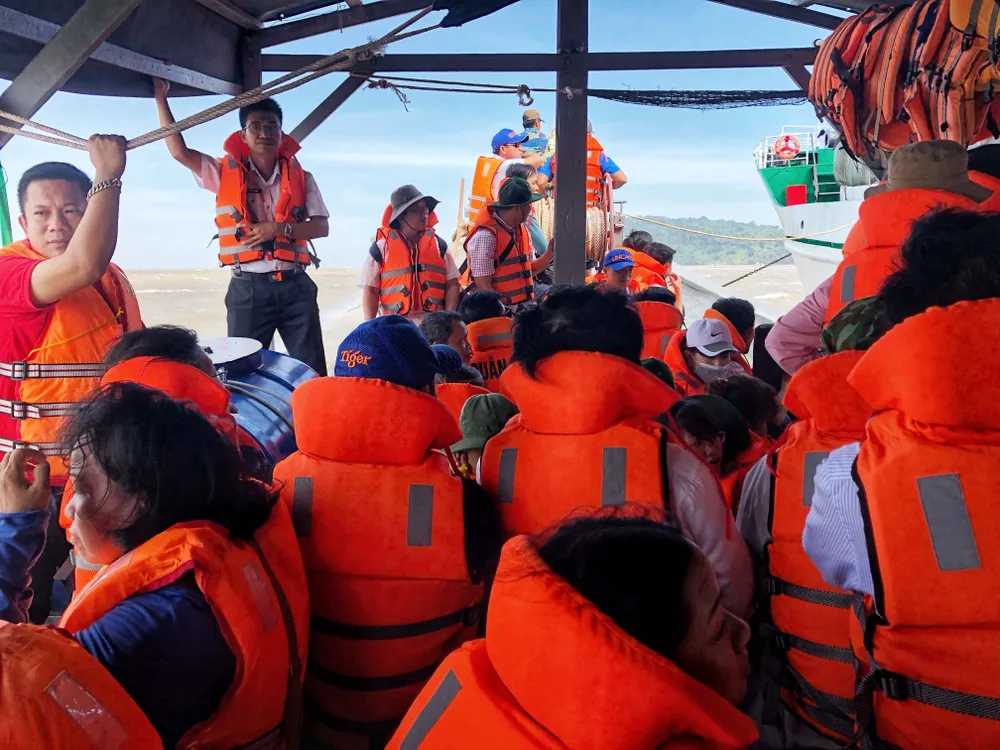 Để đến thăm, chúc tết cán bộ, chiến sĩ trên đảo, Đoàn công tác của Bộ Tư lệnh Vùng 5, đại biểu các tỉnh, thành phố phía Nam, phóng viên báo đài phải di chuyển từ tàu lớn sang tàu nhỏ từng lượt để vào đảo. Sóng biển nhấp nhô, thuyền chao đảo. Ảnh: TÍN HUY