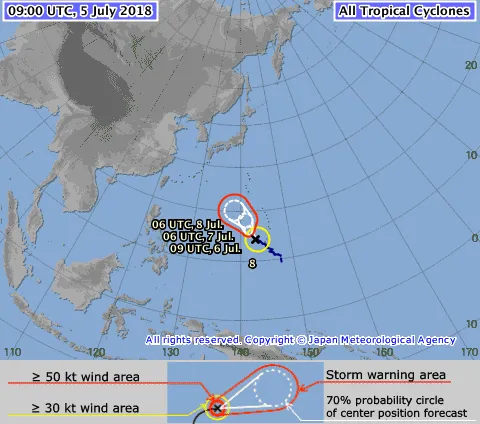 Chiều 5-7, vị trí tâm bão đang ở vào khoảng 14.6 độ vĩ Bắc và 143 độ kinh Đông, di chuyển theo hướng Tây Tây Bắc với vận tốc chậm khoảng 15km/giờ.
