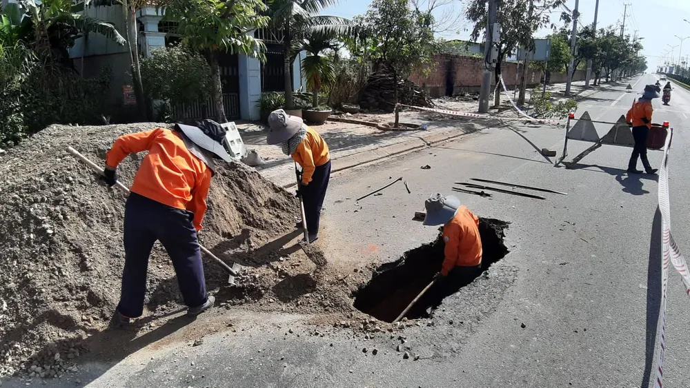 Một hố tử thần sâu khoảng 1m, rộng 1m, dài 2m bất ngờ xuất hiện trên mặt đường phố đe dọa an toàn giao thông.