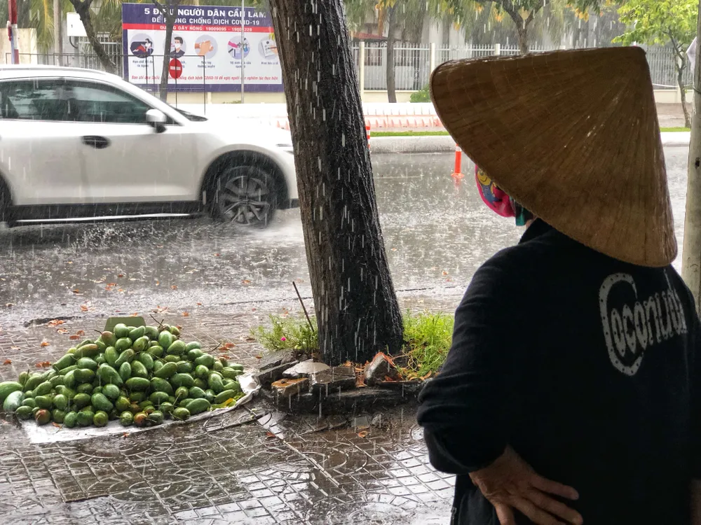 Một số người buôn bán đứng nhìn mưa. Ảnh: TÍN HUY