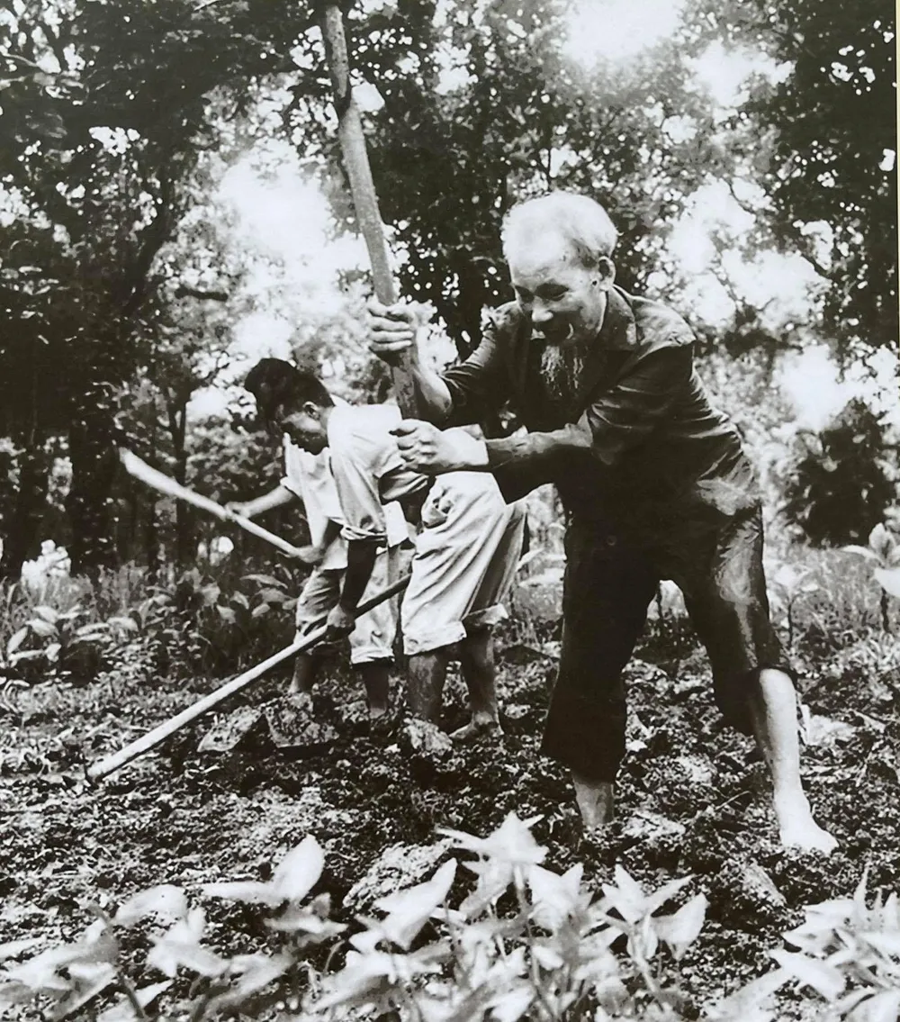 Chủ tịch Hồ Chí Minh cuốc đất trồng rau trong vườn của Phủ Chủ tịch tháng 6-1957