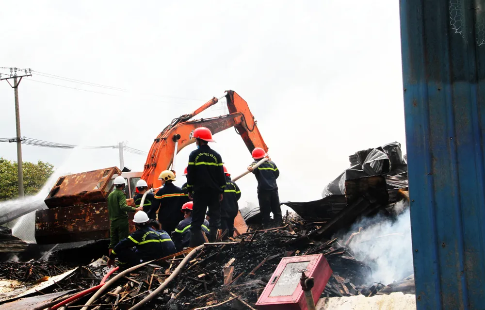 Cảnh sát PCCC tỉnh Bình Định đang nỗ lực dập tắt đám cháy tại kho chứa cũi