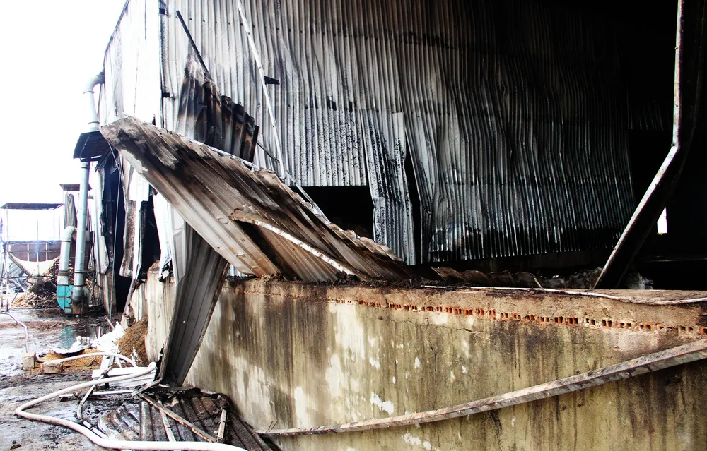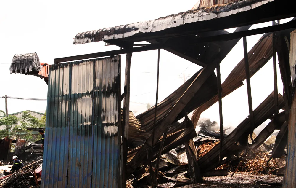 Khu nhà xưởng bị thiêu rụi, nghiêng đổ