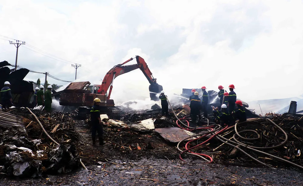 Sau hơn 12 giờ, đám cháy tại kho chứa củi của Công ty TNHH Nông Trại Xanh, đóng tại Khu công nghiệp Phú Tài (phường Trần Quang Diệu, TP Quy Nhơn, Bình Định) vẫn chưa được dập tắt hoàn toàn, hơn 3.000 mnhà xưởng đã bị thiêu rụi.
