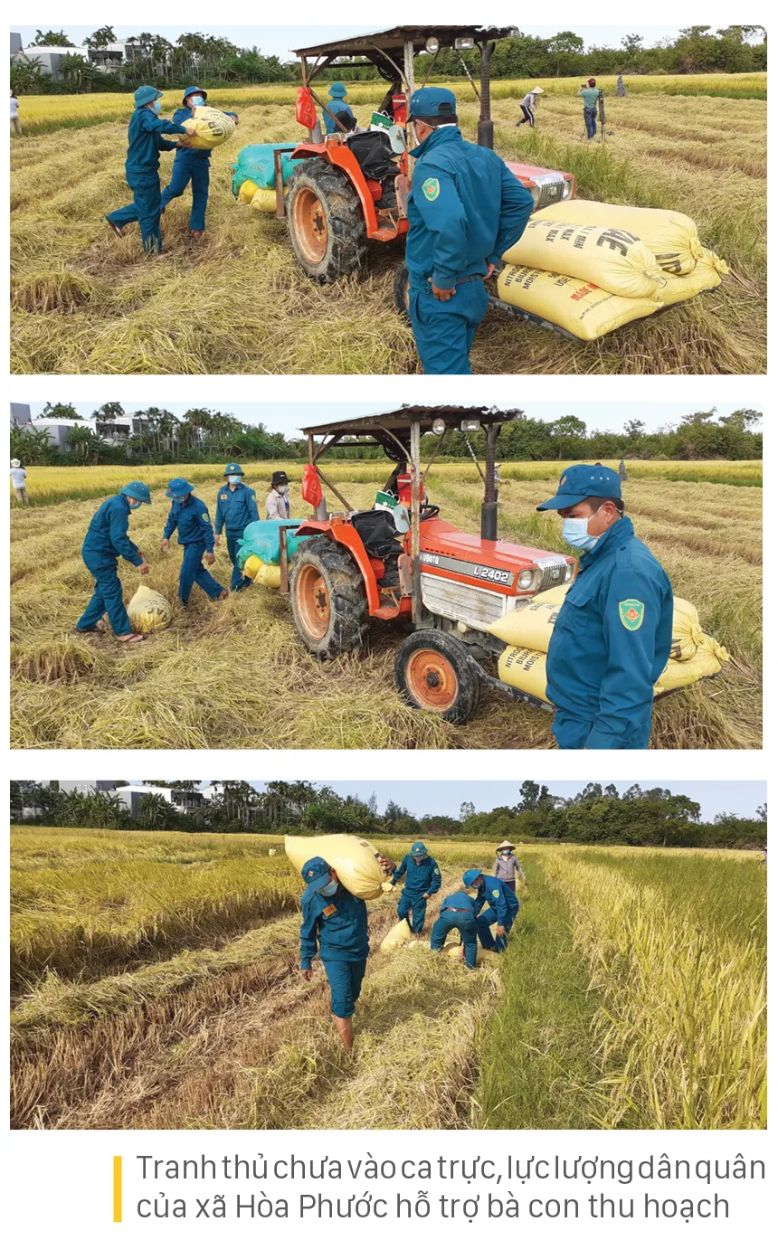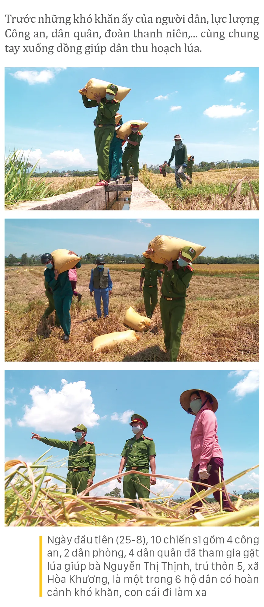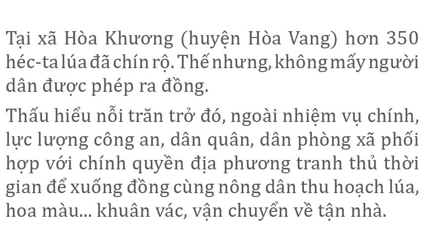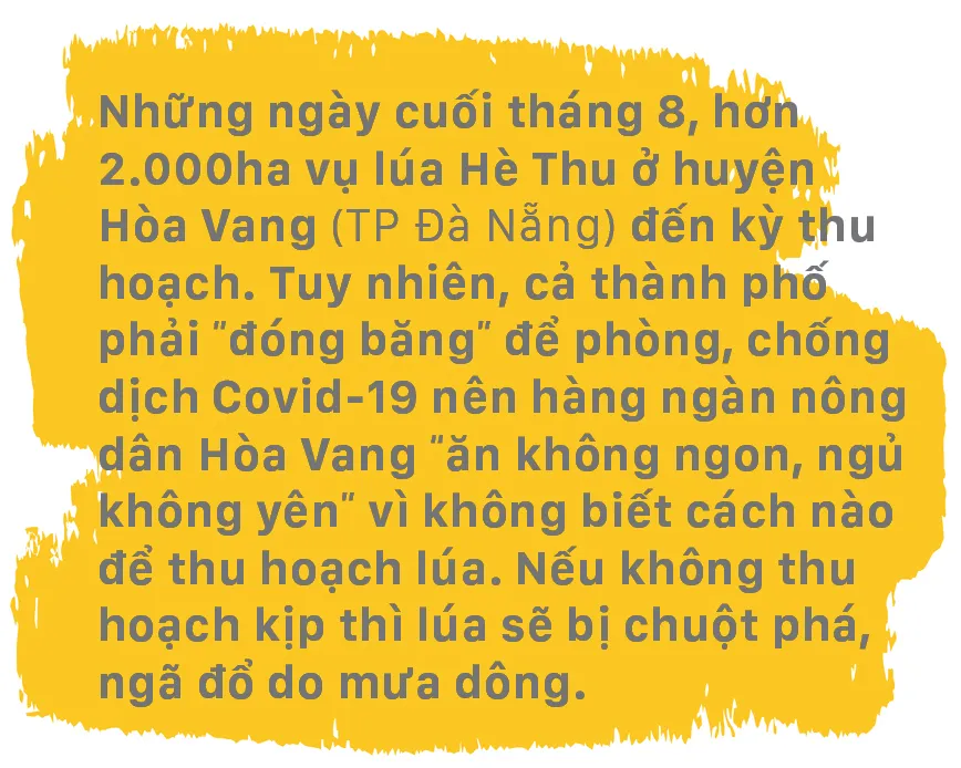 Những ngày cuối tháng 8, hơn 2.000ha vụ lúa Hè Thu ở huyện Hòa Vang (TP Đà Nẵng) đến kỳ thu hoạch. Tuy nhiên, cả thành phố phải "đóng băng" để phòng chống dịch Covid-19 nên hàng ngàn nông dân Hòa Vang “ăn không ngon, ngủ không yên” vì không biết cách nào để thu hoạch lúa. Nếu không thu hoạch kịp thì lúa sẽ bị chuột phá, ngã đổ do mưa dông. Trước những khó khăn ấy của người dân, lực lượng công an, dân quân, đoàn thanh niên,... cùng chung tay xuống đồng giúp dân thu hoạch lúa.
