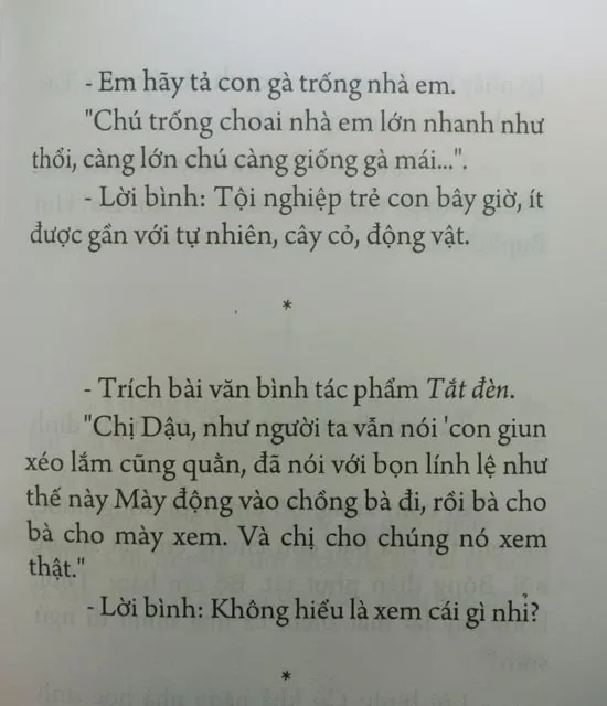 Cá biệt có những chuyện rất phản giáo dục như “Con trai của bố”, trong đó một ông bố hồ hởi kể với người hàng xóm: “Tôi thấy tự hào vì thằng con trai mình. Hôm qua tôi nhận được bản thông báo, dạo này hạnh kiểm của cháu rất tốt. Cuối năm cháu sẽ ra tù trước thời hạn…" Hời hợt và dễ dãi, không hiểu người biên soạn cuốn sách nghĩ gì khi đưa những chi tiết vớ vẩn vào cuốn sách dành cho trẻ em. Và không biết các em học sinh có thể học được gì từ những câu chuyện nhảm nhí, vô bổ như thế này. Thậm chí, cuốn sách này còn in những đoạn văn lưu truyền trên internet được cho là nhạo báng, xuyên tạc lịch sử, đem râu ông nọ cắm cằm bà kia...